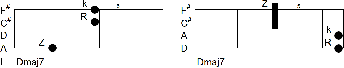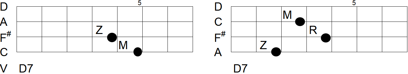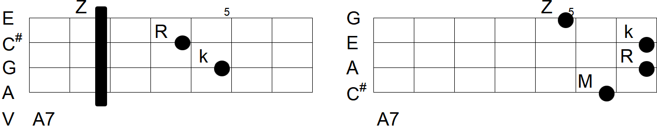 Z - Zeigefinger, M - Mittelfinger, R - Ringfinger, k - kleiner Finger. Saiten,