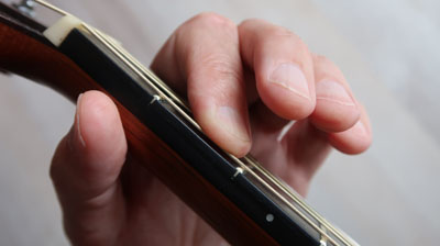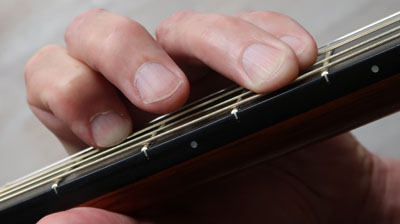 Die Finger senkrecht direkt hinter die Bünde setzen. Man sollte