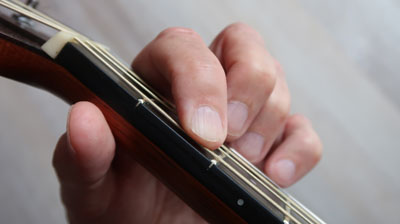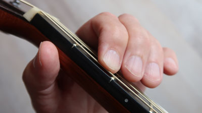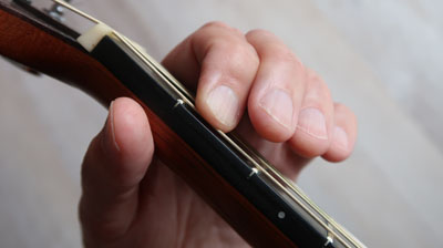 Druck der Finger auf die Saiten zu spielen.